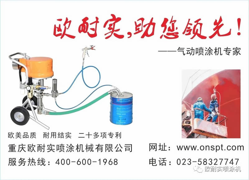 重庆欧耐实喷涂机械有限公司专业研制生产“欧美品质、耐用结实”的气动无气喷涂机,拥有核心专利技术, 获得两项发明专利和二十多项实用新型专利。在船舶、海工、机械、石化、管道、桥梁、钢结构、风电、高铁等领域的国家重点防腐工程施工中,获得了使用者的一致好评。