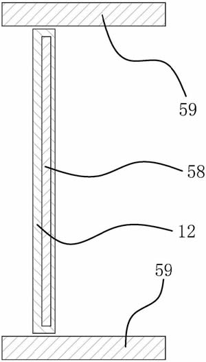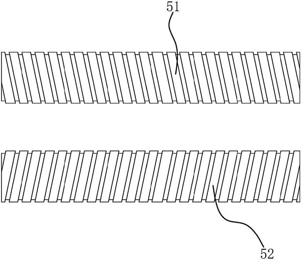 [0034] 如图1、图2、图3和图4所示,载料盒11的底部内转动连接有螺杆一51和螺杆二52,螺杆一51和螺杆二52分别通过一转轴一和转轴二相连,转轴一和转轴二上分别固定设置有齿轮一53和齿轮二54,载料盒11上转动连接有分别与齿轮一53啮合的齿轮三55、与齿轮二54啮合的齿轮四56,齿轮三55和齿轮四56啮合,载料盒11上开设有一避让孔57,上料输送带12穿过避让孔57,螺杆一51和螺杆二52的端部位于上料输送带12的一侧,且螺杆一51和螺杆二52与上料输送带12垂直;上料输送带12内埋设有若干磁条58。