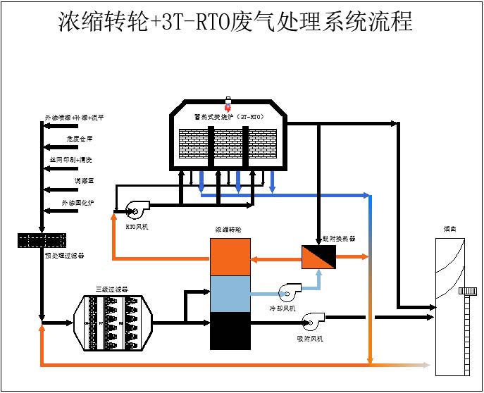 本系统用于处理喷漆及烘干炉排出的含挥发性有机废气。废气通过浓缩后高温焚烧 ,将挥发性有机物转化为二氧化碳和水,产生的热烟气一部分返回换热除温利用,一部分排入烟囱。排放烟气符合 国家及当地环保法规规定。