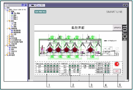 触控屏上电后进入登录界面如图4-5(a)所示,登录界面主要包括登录系统窗口、以及用户信息等内容;点击右下角进入系统按钮即可进入主界面,如图4-6(b)所示,主界面主要显示产品信息以及各主要界面进入窗口,主要用于各控制界面切换;进入控制界面如图4-5(c)所示,选择系统运行模型,控制系统运行状态;进入监控界面可显示当前各工位的工作状态,如图4-5(d)所示。一号控制柜人机界面设计如图4-6所示,下图设计的是加温模块和喷砂模块的监控界面,1显示喷砂室状态,2显示机械手状态,3显示转桶架状态,4显示加温机状态,5显示报警灯和急停按钮,当达到指定工作位置时工位状指示灯会显示绿色,否则显示为灰色,当处于非正常工作状态是报警灯会闪烁并发出警报声,需要按下急停按钮后查看工作异常位置。