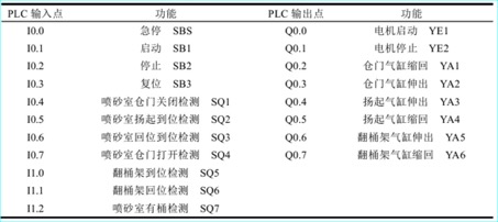 通过对工序流程的分析,喷砂机模块的控制需要7个信号采集点、4个控制按钮作为PLC的输入点,区别前面章节的I/O点分配,对控制喷砂机的输入输出点重新分配,如表4-4所示: