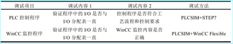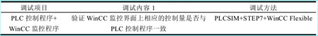 本文现场位于天津市滨海新区天津瑞驰船舶机械有限公司厂房内,由于生产线的机械结构仍在优化阶段,所以控制系统的调试处于测试阶段,而且现场环境伴随着噪声、灰尘、高压电流等复杂恶劣因素,调试现场与实验室距离又远,通过PLCSIM进行实验室模拟调试的方式既安全又经济。依照系统调试方法分别设计了单独调试和联合调试两步调试方案。单独调试方案是应用PLCSIM软件分别模拟PLC和WinCC组态运行。单独调试内容方案如表5-1所示。