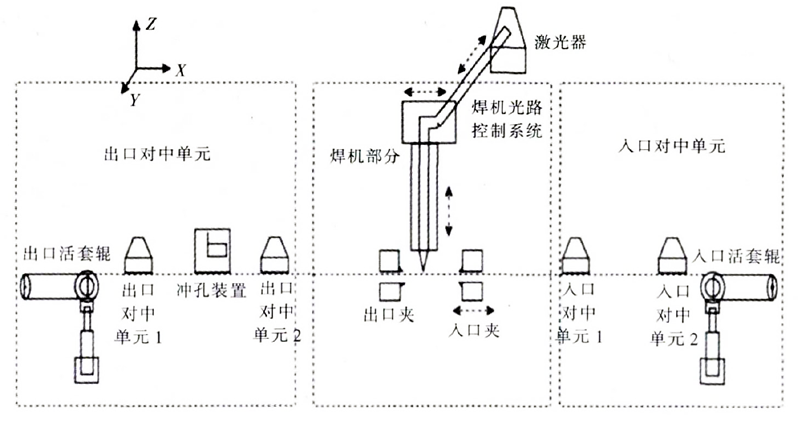 以德国克莱西姆LW22型激光焊机为载体,重新设计以西门子PLC为核心控制器的整个控制系统。激光焊机机构运动比较复杂,主要运动机构有活动梁光路装置和夹紧装置,焊接过程中工艺流程主要有焊接准备、带头准备、带尾准备、带钢调整、焊机光路系统启动、完成焊接等。薄板金属焊接生产线如图1所示。