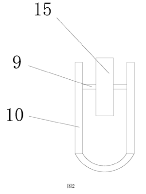 所述弹簧伸缩机构包括半包围横梁下部的U形支架10,U形支架10内设置有固定轴9,固定轴9在横梁的上方。固定轴9上安装有转轮15,转轮15的下端与横梁的上端接触运动。所述U形支架的下端连接有弹簧外壳8,弹簧外壳8内设置有扭簧7以及与扭簧连接的伸缩带6,伸缩带呈盘状。此处借鉴了卷尺的结构。所述伸缩带的下端连接挂钩。