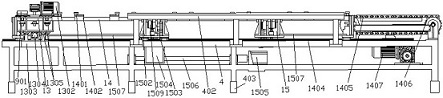所述平行转杆1404由多根首尾连接的转杆单元构成,所述限位凸杆1401分别与转杆单元固定连接,相邻两根转杆单元之间通过传动连接座15连接,所述转杆单元分别转动连接于所述连接座底座1501顶部所设的支撑立架1502,所述传动连接座15通过轨道C401与上盖传送装置4滑动连接。