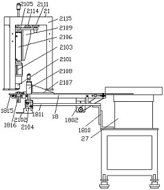 当活塞杆Z退回活塞Z1816至最大行程处的时候, 所述防雨盖定位托盘与送料槽1804匹配;当活塞杆Z伸出活塞Z1816至最大行程处的时候,所述防雨盖定位托盘向上提升至防雨盖定位托盘的防雨盖所在高度与活塞杆W退回活塞W2106至最大行程处、且活塞杆V伸出活塞V2103最大行程处的时候的防雨盖取盖装置2101的高度匹配。