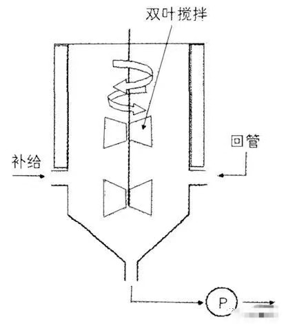 水性输调漆系统采用双叶式搅拌器(见图3) 。回管和涂料补给管均设置在涂料槽底部,搅拌器和涂料槽的材质均选用不锈钢材料。涂料槽应具备高密闭性,防止槽内结皮。不生产时,水性涂料搅拌器的泵频可以调低一半,待上班时再调到正常工作频率,这样可以减少能耗,同时减轻对油漆的剪切作用。
