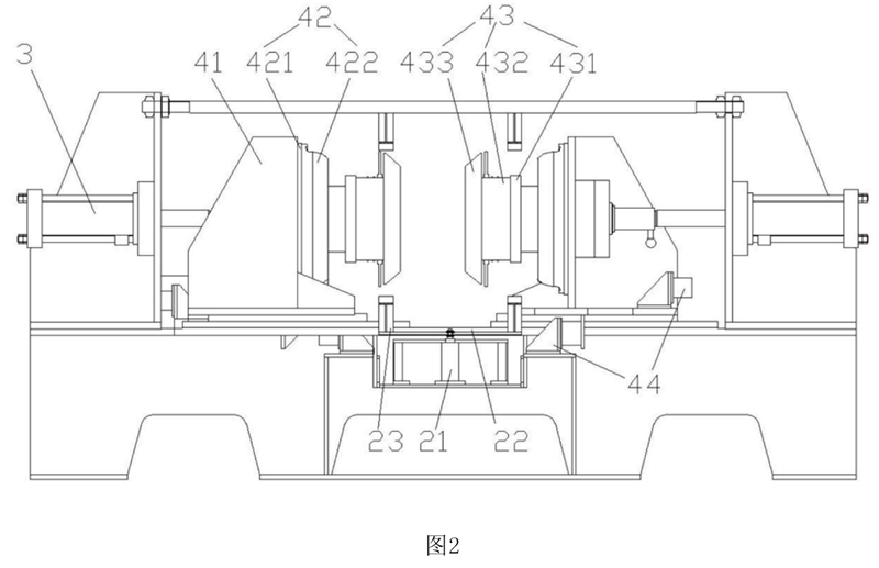 如图1、图2和图3所示,扳边胀筋机构4包括机箱41,机箱41远离机身1中心的一端与进给机构3连接,机箱41靠近机身1中心的一端设有扳边机构42,扳边机构42远离机箱41的一端设有胀筋机构43。