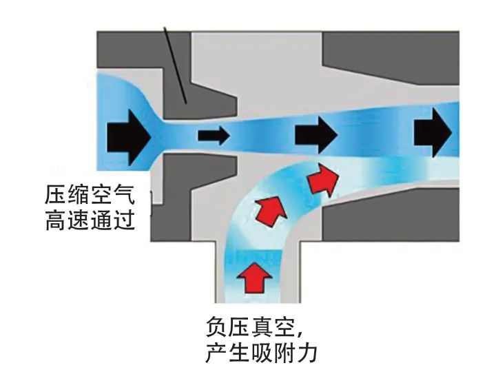 机器人吸附零件的主要原理是通过利用大气压压差实现吸附动作。如图1 所示,压缩空气高速流过时,在附近的吸口产生负压真空,即吸附力。通过在吸附口增加吸附部件(如吸盘等),通过利用压差的作用力,可以实现零件的吸附动作。