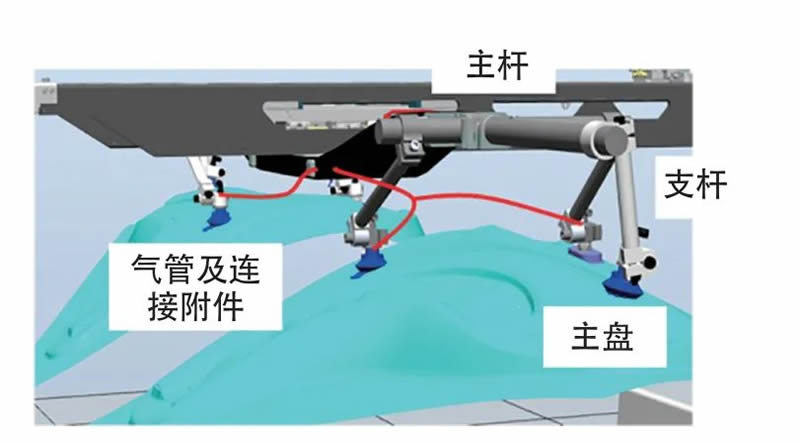 端拾器是实现零件吸附,搬运零件的执行部件。端拾器主要由主杆、支杆、吸盘、气管及气管连接头等附件组成,如图3 所示。