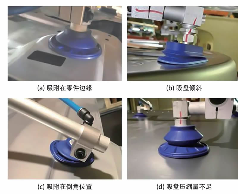 吸盘布置于端拾器上,是实现零件吸附的直接执行部件。吸盘的布局包括吸盘在零件型面上的吸附位置、吸盘的布置角度、布置高度三大主要方面。吸盘布局也是保证零件正常吸附,顺利完成搬运的重要影响因素。在某车型某零件掉件问题排查过程中,发现存在4 种不合理的吸盘布局情况,如图4 所示。上述四种不合理的吸盘布局情况,最终都会导致吸盘的吸附面出现贴合不良,导致吸盘漏气,造成气密性异常,无法吸附起零件或者造成异常掉件。