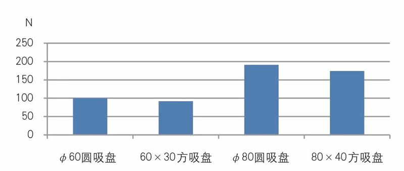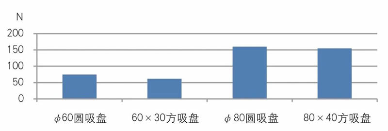 目前,市场上用于机器人零件吸附使用的吸盘种类、规格较多。通过分别对不同规格的吸盘进行吸附力试验,得出每种吸盘的吸附力数据(图5、图6,包括拉脱力和横向力,拉脱力是指上下方向吸盘的吸附力,横向力是指左右方向的吸附力)。