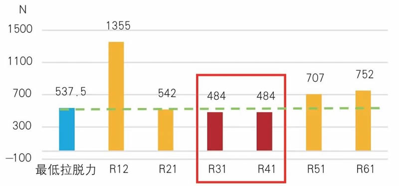 再通过对比零件的实际重量与每个频发掉件机器人的总吸附力数据,发现其中有两个工序的机器人(R31、R41)的拉脱力和横向力都低于使用要求(图7、图8)。通过更换吸盘,增加端拾器总体的吸附力,能够彻底消除掉件异常。