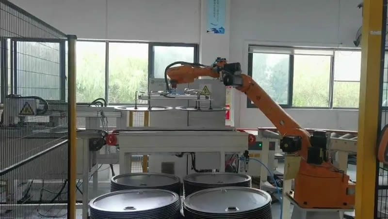 该机器人码垛速度可达14-18个/分钟,实现了冲锁桶盖智能化码垛制桶生产线