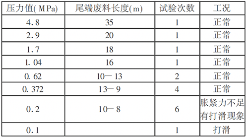 基于光滑表面的摩擦没有具体的计算依据只能通过试验来取得数据, 于是我们通过试验减少胀紧系统工作压力使之达到让胀紧爪与钢卷之间形成真实弹性接触。