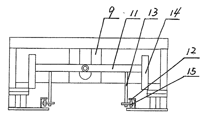 为了增加运动的稳定性,在托板8 上固定有两条推桶定位滑道12 ,每条滑道内分别设置有滚轮15,推桶汽缸的推动杆上连接有推桶臂9,推桶臂9 与推动梁1 1 连接,与滚轮1 5 连接的支撑梁1 3 分别与推动梁1 1 连接,推动梁的两端分别连接有推桶架14 。当推桶汽缸动作时,带动与其连接的推桶臂运动,推桶臂带动推动梁、推桶架、支撑梁运动,从而带动滚轮在滑道内滑动,和推桶弧板一起将桶推入刷洗设备中。