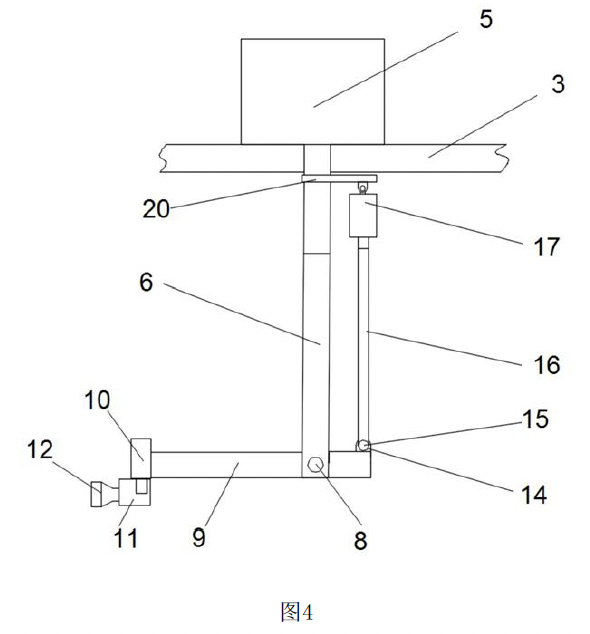 本实用新型的钢桶下线内检装置工作时,首先将第二连接板9收拢在第一连接板6的安装槽7内(如图2所示);在支架1下方放置钢桶;驱动第一气缸2;第一气缸2带动安装架3下降;从而将摄像头13、探照灯12、第一连接板6、第二连接板9以及马达10从钢桶的大丝口伸进钢桶内;驱动第二气缸17;第二气缸17拉动连接杆16;连接杆16拉动第二连接板9饶第一转轴8转动并打开;图4为打开至第一连接板和第二连接板9呈直角状态;继续驱动第二气缸17还可以进一步增大夹角;再通过伺服电机5旋转调整第二连接板9前方的摄像头13的位置;通过控制第二连接板9的长度,还可以实现将摄像头13调节到钢桶正中心位置;方便对桶内的任何方位进行观察;探照灯12可以提供摄像头13拍照需要的光源;马达10可以调整摄像头13的方向。摄像头13拍照后,分析显示控制器18对于拍的照片进行分析,如果存在污染物或者异物,通过声光报警器19发出警报。