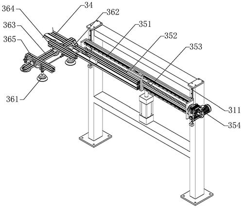 如图3所示,吸盘361组件36包括架体、吸盘361,架体包括可拆卸连接在横杆34上的固定支座362、可拆卸固定连接在固定支座362上的支撑杆、螺纹连接在支撑杆上的两个支撑座364、固定连接在支撑座364上的连杆365,吸盘361可拆卸连接在连杆365两端,连杆365与支撑杆垂直,在后续使用过程中,由于中间加工机械的不同,吸盘361组件36之间的距离也就会发生改编,因此,使架体可拆卸的固定在横杆34上,只需要更改调节各个架体之间的距离,就能够适应不同加工工装,适应范围广,同时,当吸盘361组件36移动到桶盖9上方时,通过多个吸盘361对钢桶进行吸附,转移,吸盘361接触段的塑性能够避免对桶盖9造成划伤。