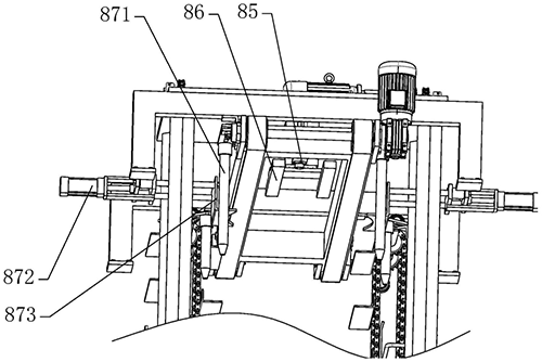 如图4、图5所示,中转件包括设置在机架51顶部的传送带7,传送带7带有磁性,传送带7通过磁性吸附将桶盖9吸附在传送带7上,传送带7端部的机架51上设置有感应器,感应器感应到钢桶被传送到码垛件8的上方时,下料件便将吸附在传送带7上的桶盖9顶下来,落在码垛件8上,进行码垛工序。如图4所示,码垛件8包括堆叠板81、驱动组件、下料件、定位件87,驱动件35包括堆叠电机82、堆叠链条83,堆叠辊84,堆叠辊84转动连接在机架51上,堆叠电机82驱动堆叠辊84转动,堆叠链条83固定连接在堆叠辊84上,堆叠板81固定连接在链条上,下料件包括设置在机架51顶部的下料气缸85,下料气缸85端部设置有下料板86,下料件设置在中传送带7之间,下料气缸85驱动下料板86向下运动推动吸附在传送带7上的桶盖9脱离传送带7落在堆叠板81上,感应器感应到钢桶被传送到码垛件8的上方时,感应器控制下料气缸85驱动下料板86将钢桶向下推下,使钢桶落在堆叠板81上,而堆叠板81通过堆叠电机82带动堆叠板81上下运动,控制堆叠板81上的桶盖9与上端的高度差,避免堆叠板81与机架51上方落差太大导致桶盖9损坏或下落出现偏差而无法进行桶盖9的堆叠,堆叠板81与机架51之间的高度差太小而无法堆叠较多的桶盖9,利用效率低,堆叠电机82能够带动堆叠板81上下运动,调节堆叠板81的高度安全便捷使用效率高。