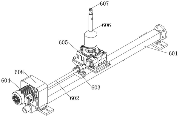 在本实施方式中,通过喷淋头506对钢桶进行清洗。清洗组件6包括清洗管601,清洗管601的两端通过清洗管固定架安装在主体框架101上,清洗管601的上方设置有蜗轮轴602,蜗轮轴602通过第二安装轴承603转动安装在清洗管601的上表面,蜗轮轴602的端部传动连接有清洗电机604,蜗轮轴602远离清洗电机604的一端设置有减速机605,减速机605上设置有固定杆606,固定杆606上端设置有清洗喷头607。