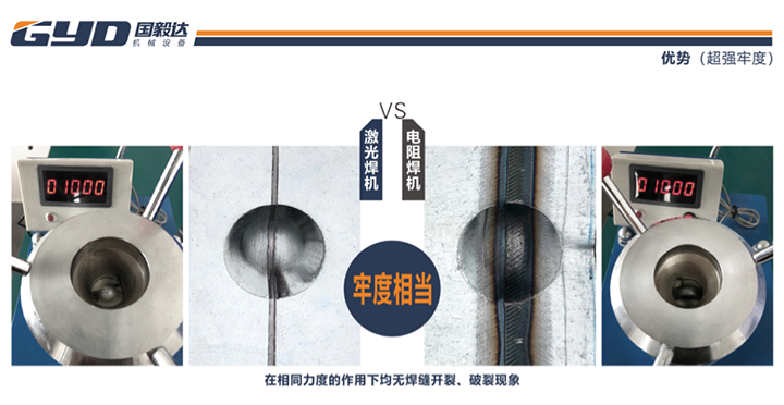 传统电阻焊机需要焊接材料相互搭接(搭接量为4-5mm),焊接完成后焊缝处厚度约为焊接母材厚度1.8倍。而激光焊机为母材360度无缝平整对接,焊接完成后与母材厚度一直平整。