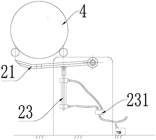 在一些实施例中,所述驱动装置包括气源、第一输气管路和旋转气缸23,所述气源通过第一输气管路通气至旋转气缸23,进而控制旋转气缸23工作。更为具体地,输气管路上设置有第一电磁阀231,第一感应开关213通过控制第一电磁阀231的开闭来控制旋转气缸23是否工作。在本申请的部分实施例中,所述缓冲臂21上设置有用于承接所述钢桶4的柔性缓冲部211。