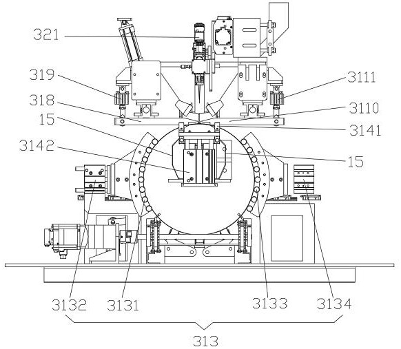 31、定位机构,311、左底座,312、右底座,313、抱紧机构,3131、第一圆弧形抱件,3132、第一抱件驱动件,3133、第二圆弧形抱件,3134、第二抱件驱动件,314、第一高度对齐机构,3141、挡板,3142、挡板驱动件,315、第二高度对齐机构,3151、弹簧定位销,3152、弹簧定位销驱动件,316、平整面,317、槽口,318、第一压板单元,319、第一压板驱动件单元,3110、第二压板单元,3111、第二压板驱动件单元,3112、铜块,3113、定位挡片单元,3114、定位挡片驱动件单元,3115、第二支撑辊轮,3116、下压轮;