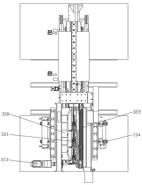 电缸322、三个激光焊接头气缸共同驱动三个激光焊接头321复位,若干第一压板单元318、若干第一压板单元318抬起,第一圆弧形抱件3131、第二圆弧形抱件3133打开复位;第一高度对齐机构314的挡板3141下降复位,第二高度对齐机构315的弹簧定位销3151整体水平向伸出复位;