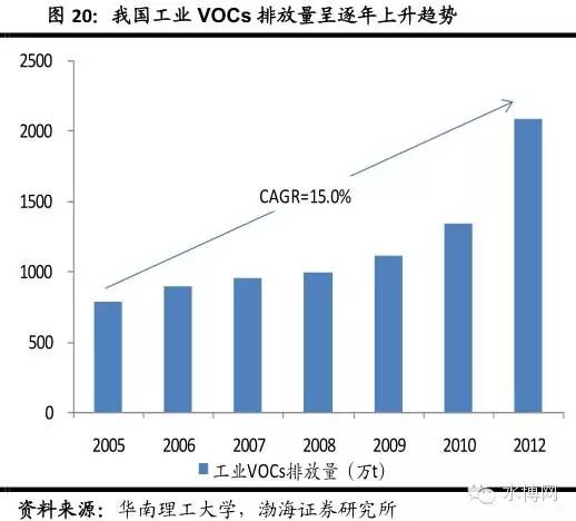 随 着我国重化工业的快速发展、能源消费的持续增加,加之长期以来我国未将VOCs纳入常规污染物管理范围,VOCs治理行业发展缓慢(2013年我国 VOCs治理行业产值仅32~38亿元,140多家从业企业中产值过亿元的仅有3~4家),近几年VOCs排放量呈快速增长态势,2012年我国工业 VOCs排放量为2,089万吨,比2005年增长了约1.7倍,年复合增长率达15.0%。大量的VOCs排放已成为导致我国严重雾霾天气产生的重要因 素之一,其污染治理势在必行。
