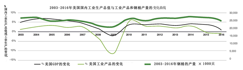 随着对钢桶生产与国内工业生产总值关系的进一步研究,美国发现了一个重要的趋势,即钢桶生产与国内生产总值和工业产品数据的变化密切相关。这些数据与工业产品进行比较,发现它更准确地反映了使用钢桶的市场。