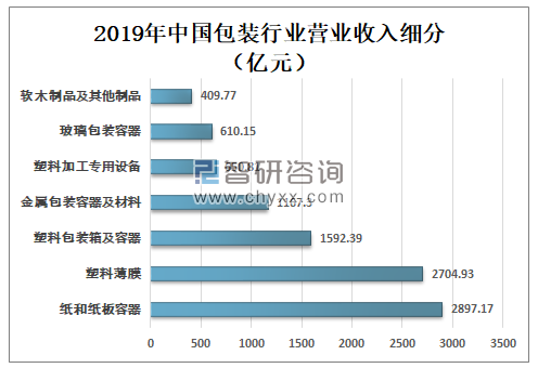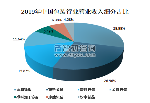 智研咨询发布的《2020-2026年中国包装行业市场竞争策略及投资趋势预测报告》数据显示:其中,纸和纸板占包装行业营业收入的28.88%;塑料薄膜占包装行业营业收入的26.96%;塑料包装占包装行业营业收入的15.87%;金属包装占包装行业营业收入的11.64%。