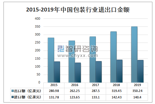 随着我国对外贸易规模的不断扩大,包装行业出口市场也表现活跃。我国包装行业出口不断增加。2019年中国包装行业出口金额为350.24亿美元,同比增长9.64%;中国包装行业进口金额为140.4亿美元,同比下降1.43%。