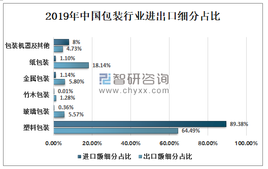 其中,塑料包装占进出口额比例较大,塑料包装进口额占比89.38%,出口额占比64.49%;玻璃包装出口额占比5.57%;金属包装出口额占比5.8%;纸包装出口额占18.14%;包装机器及其他出口额占比为4.73%。