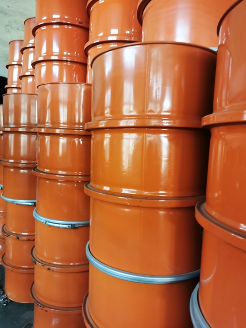 进入大桶车间,首先看到特殊要求的200升钢桶,此钢桶是在钢桶两个胀筋环处加特殊桶箍。请看下图。