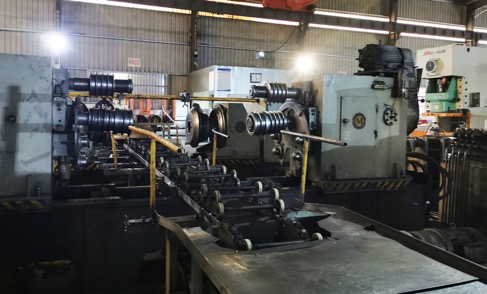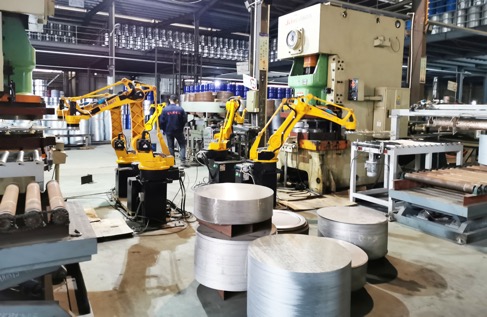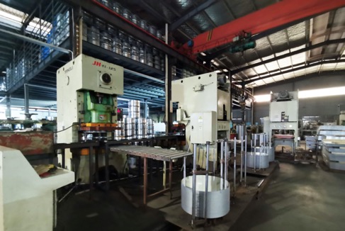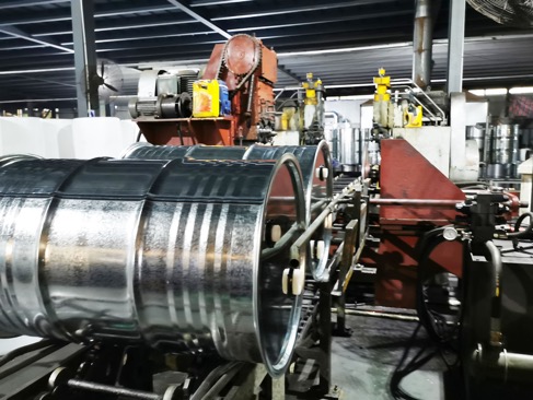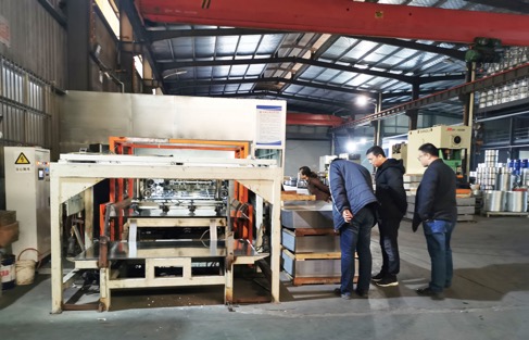 下面我们一起去车间看看,进入车间大门,首先映入照用帘的是桶底顶开卷校平落料生产线正在开卷镀锌钢板,大家看到贝氏制桶桶底顶落料及拉伸与自己家不同,纷纷询问其原因。其实这是贝总为预涂板钢桶做的工作,大家都知道,钢桶桶底顶的下料角最多,但如果涂了涂料及覆了塑料膜,那下角料的价格将一落千丈,甚至无人问津。为此他先将桶底顶盖的料落下来,然后再涂装或覆膜,既节省了涂料又不会造成废料污染和损失。桶底顶片料易于保存和运输,便于实现规模化生产。且桶底盖模具由于不带刃口,模具寿命将会增长,冲床吨位也会减小。