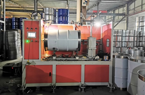 全自动钢桶磨边机,设备自带粉尘收集系统,另有专门房间进行隔音和隔尘,车间安全卫生