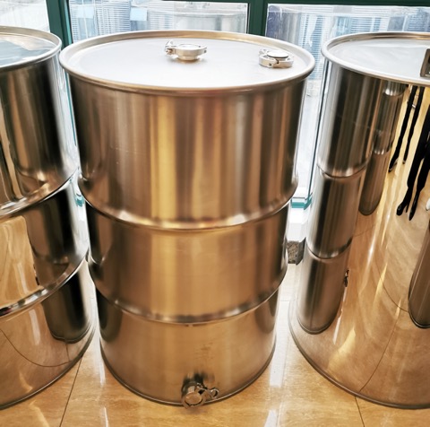 图视三只的不锈钢桶各不相同,中间这个桶采用管箍式桶口连接方式,简单便捷,可多次重复使用,桶身下方有排料或排污口,便于物料的装卸和桶的清洗。右则开口不锈钢桶不压环筋,桶身内壁表面光滑,不易藏污纳垢,桶底、顶卷封处整圈焊接,增加了钢桶的强度,是食品、医药的最佳选择。