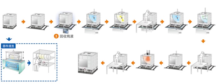 流程:接收、拆解→接收后检查→回收残液→预洗(用水清洗容器内部)→药剂清洗→内部检查和局部清洗(清洗注入口和阀门)→喷淋冲洗(用清水冲洗容器内部)→吹干(除去水份)→内部检查并装设部件(阀门等)→气密检查(容器内负压,检查气密状况)→内部干燥(热风烘干)→最终检查并安装部件→产品出厂。