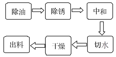 根据油桶内部的污物分析可知,油桶内的污物主要是油污和铁锈。油污黏在油桶内壁上,铁锈常常被油污包裹,附着在油桶内壁上,形成很大的污垢块,其中部分污物仅轻轻附着在桶壁的表面,而有些污物则是胶着在桶壁上的顽固污块。由于油桶污物的这种特性,需要首先选择除去油污,当油污全部去除干净后,藏于油污下的锈蚀将会完全暴露出来。接着进入下一个工位进行酸洗除锈蚀。待酸洗结束后,油桶内还残留部分酸液,酸液长时间存在于桶内将腐蚀油桶,且将影响所装油品的质量,所以必须将油桶内残留酸液除去,于是碱中和是该清洗工艺中必不可少的步骤。通过碱和酸的中和反应除去桶内的酸液,之后在同一工位再通入清水进行漂洗,将没有消耗的碱液漂洗出油桶。漂洗后的油桶内有大量的水,若此时直接出料,油桶内的水结合空气中的氧气作用很快使油桶再次生锈,所以必须在清洗结束后添加干燥过程。因为桶内残留大量的水分,在真空清洗干燥中使用的清洗剂为碳氢溶剂,碳氧溶剂与水不溶,将形成乳化液,不方便循环利用,难于处理,所以必须在真空清洗干燥工位之前设有将水从油桶中除去的工位,即切水工位。切水结束后的油桶内还残留大量的切水剂以及在之前清洗过程中没有完全清除干净的污物。进入干燥工序后,进行真空蒸汽清洗和真空干燥,油桶边角和小缝隙中的污垢及最后留于油桶内的碳氢溶剂将最终被除去。干燥结束后,油桶出料,此时的油桶内没有了油垢和锈蚀等污物,而且油桶内部干燥。综上所述,选择的清洗工艺如图三所示。