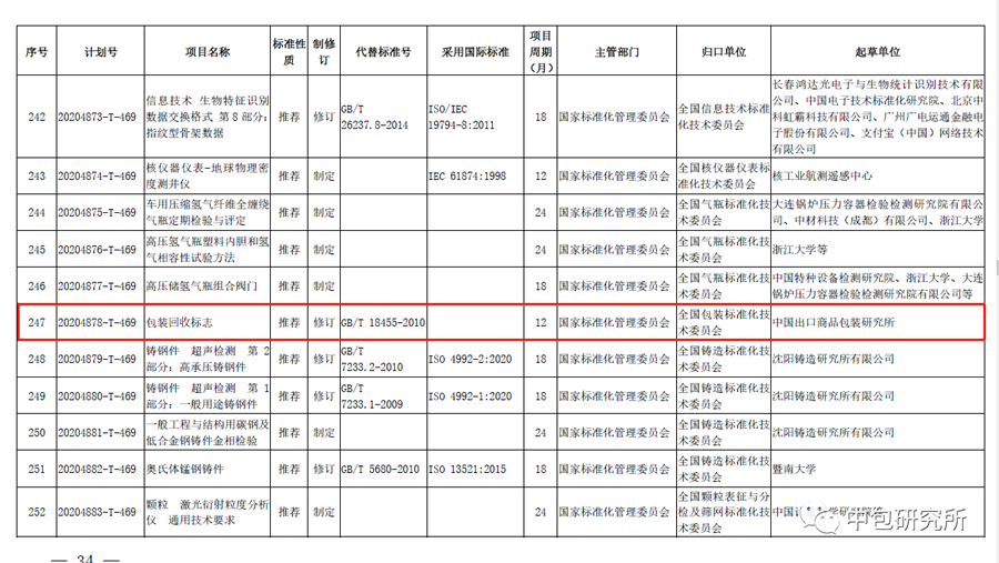 2020年12月24日,国家标准化管理委员会印发了国标委发 [2020] 53号《国家标准化管理委员会关于下达2020年第四批推荐性国家标准计划的通知》。其中,由全国包装标准化技术委员会归口,中国出口商品包装研究所牵头起草的GB/T 18455《包装回收标志》(计划编号20204878-T-469)和GB/T 23156《包装 包装与环境 术语》(计划编号20204929-T-469)等两项国家标准修订项目获准立项。