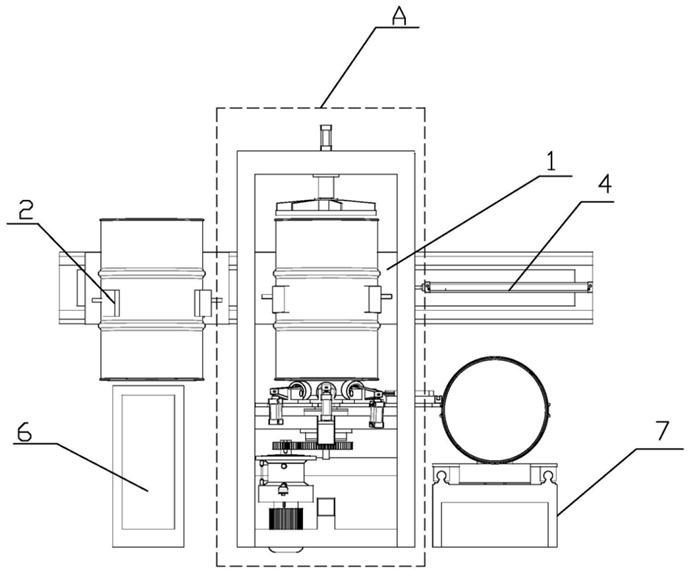 本实用新型立式落盖系统的结构示意图如图2-图4所示,包括桶移位单元、立式落盖机A、桶输送机构6、托桶架7及卸盖机构8。所述立式落盖机A位于落盖工位处,所述桶输送机构6位于上桶工位处,所述托桶架7及卸盖机构8位于卸盖工位处。本实施例中的桶输送机构6采用链式输送机。所述桶移位单元包括移位拖车1及移位驱动机构4,所述移位拖车1上安装有抱桶夹2、抱桶夹扭转驱动机构5及抱桶夹夹紧驱动机构3,所述移位驱动机构4与所述移位拖车1连接驱动所述移位拖车1移动。所述抱桶夹夹紧驱动机构3驱动所述抱桶夹2抱紧或松开钢桶。所述抱桶夹扭转驱动机构5驱动所述抱桶夹扭转一定角度,使桶由立式转成卧式。根据使用需要可以设置两组桶移位单元,分别位于上桶工位及落盖工位。所述立式落盖机A的结构如图1所示,包括机架A-9、下压盘A-2、下压盘驱动机构A-1、托盘A-4、托盘旋转驱动机构A-5、开缝单元A-3、扒缝单元A-6、展压单元A-7及切边单元A-8。所述开缝单元A-3、扒缝单元A-6、展压单元A-7、切边单元A-8及下压盘驱动机构A-1安装于所述机架A-9上。所述下压盘驱动机构A-1与所述下压盘A-2连接驱动所述下压盘A-2移动。所述托盘旋转驱动机构A-5与所述托盘A-4连接驱动所述托盘A-4旋转。所述下压盘A-2与所述托盘A-4相对设置。所述开缝单元A-3、扒缝单元A-6、展压单元A-7及切边单元A-8沿桶底圆周方向设置。所述移位拖车1与所述机架A-9滑动配合。