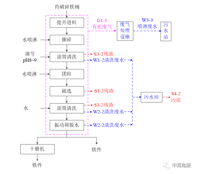 再生金属材料,是指将废钢桶内、外壁所沾染的含有毒性、腐蚀性等危险物质清除后,经过撕碎、破碎、压制、压平、磁选、团粒、压块等方式制备成团状、板状和块状等一定规格形状的金属材料。破损不能翻新再生的200 L废钢桶、翻新3次后的200 L废钢桶、200 L以下废钢桶,则经过清洗、破碎后制成金属板材或金属团粒进行再生利用。目前采用的工艺流程有“去残→清洗→切盖/剖桶→清洗→压平”、“去残→撕碎→清洗→破碎/团粒→磁选→二次清洗→脱水”。处理过程中产生废气、废水和废液,应对其进行相应处理后进行排放。