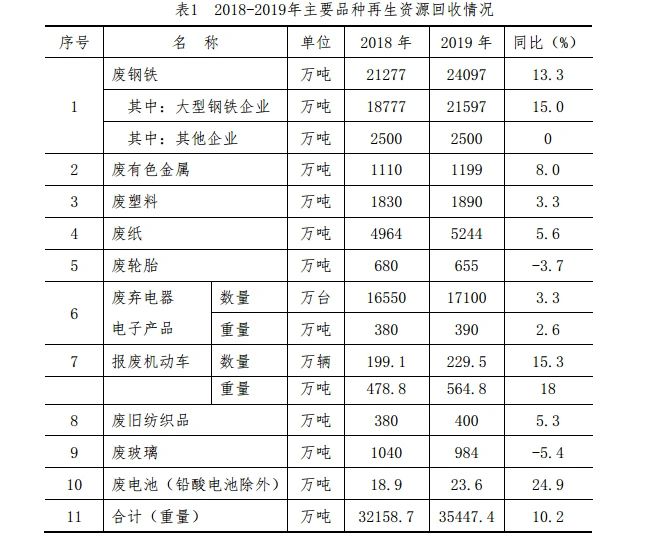 2019年,我国再生资源回收企业约10万家,回收行业从业人员约1500万人。截至2019年底,废钢铁、废有色金属、废塑料、废轮胎、废纸、废弃电器电子产品、报废机动车、废旧纺织品、废玻璃、废电池十大品种的回收总量约3.54亿吨,同比增长10.2%。2018-2019年主要品种再生资源回收情况如表1所示。