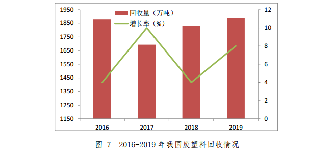 2019年国内废塑料回收量约1890万吨,较2018年增加了60万吨,增幅为3.3%。2019年废塑料进口量几乎为零。2016-2019年我国废塑料回收情况如图7所示。