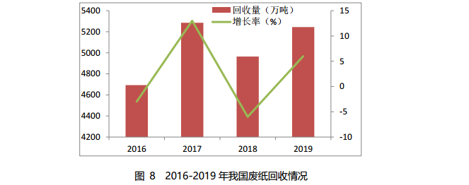 2019 年,我国废纸回收量约 5244 万吨,同比增长5.6%,废纸回收率为 49.0%,废纸利用率为 58.3%。在固体废物进口政策影响下,进口废纸量持续下滑,国内废纸回收量呈上升趋势。2016-2019 年我国废纸回收情况如图 8 所示。