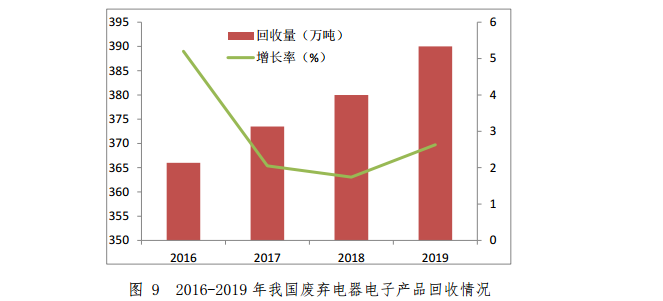 (一)回收总量2019年是新中国成立70周年,也是全面建成小康社会的关键之年。我国政府加大逆周期调节、积极实施“六稳”政策,国民经济运行保持在合理区间,非金属矿物制品业、黑色金属加工业、有色金属加工业等在上年增速回升的基础上继续保持较快增长。