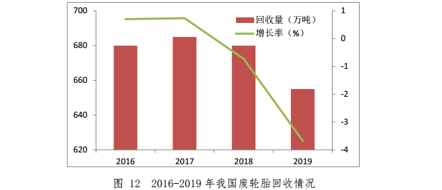 2019年,我国汽车轮胎产量为6.5亿条,其中国内消耗约3.8亿条。2019年,废轮胎回收利用企业约1500家,从业人员约10万人,回收量约2亿条,回收重量约655万吨,同比下降3.7%。其中,轮胎翻新量约500万标准折算条,再生橡胶产量约300万吨,橡胶粉产量约100万吨,热裂解处理量约100万吨。2016-2019年我国废轮胎回收情况如图12所示。