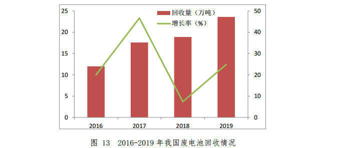 2019年,废电池(铅酸电池除外)回收量约 23.6 万吨, 同比下降5.5%。其中,不能充电的一次电池回收量约2.5 万 吨,能够充电的二次电池回收量约21.1万吨。2016-2019 年我国废电池回收情况如图 13 所示。