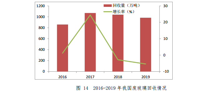 2019 年,我国废玻璃回收量约 984 万吨,同比下降5.4%。其中,废平板玻璃回收量约591.6万吨,占总回收量的60.1%,同比增长5.6%;废日用玻璃回收量约 299 万吨,占总回收量的 30.4%,同比下降 0.3%;其他类废玻璃回收量约 93.3 万吨,占总回收量的 9.5%,同比下降 48.2%。2016-2019 年我国废玻璃回收情况如图 14 所示。