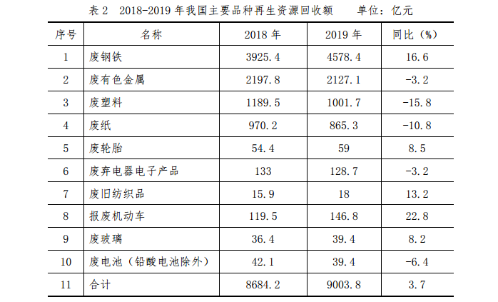 2019年,我国十大品种再生资源回收总额约9003.8亿元,同比增长3.7%。报废机动车、废钢铁、废旧纺织品、废轮胎、废玻璃等品种的回收额均有增长,其中报废机动车回收额增幅最高,同比增长22.8%。2018-2019年我国主要品种再生资源回收额如表2所示。